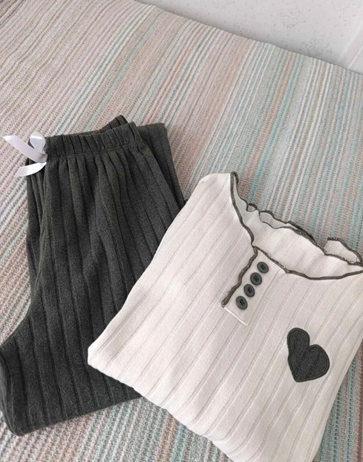 Uzun kollu, midi boy, bol kesim kadın pijama takımı. Beyaz üstte kalp ve düğme nakışları, gri ribanalı pantolon ile rahatlık sağlar.
