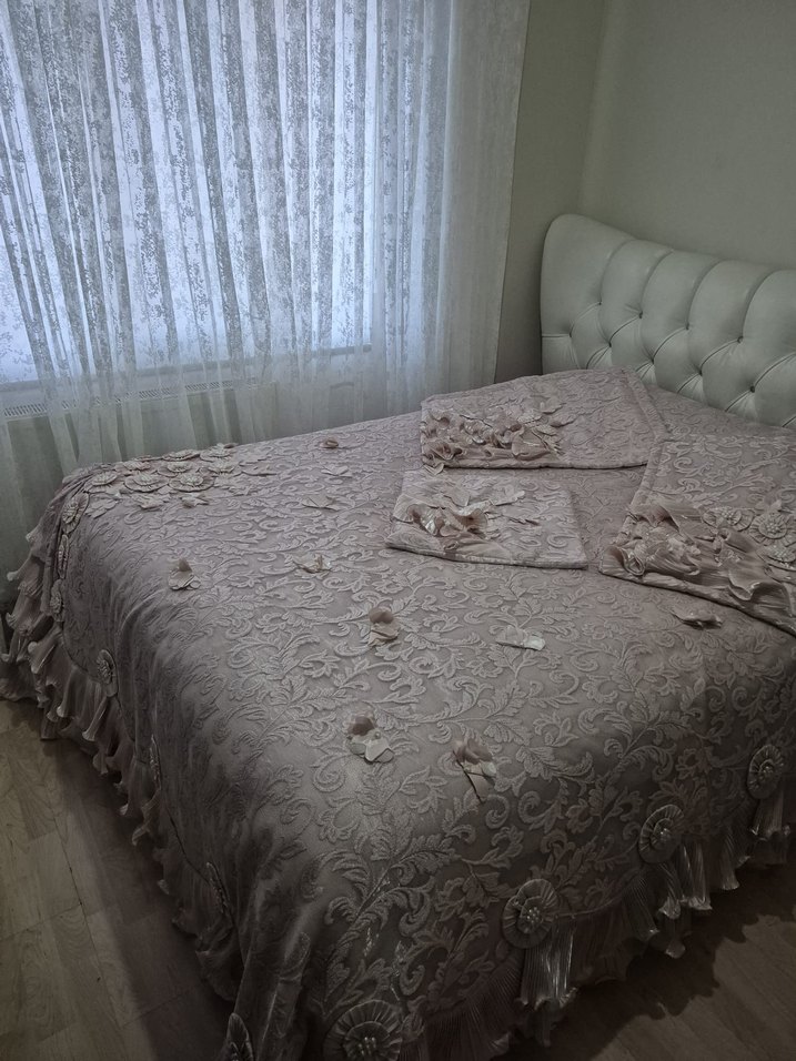 Yatak odasına şıklık katan, gri ve beyaz tonlarında nakışlı desenli yatak örtüsü.