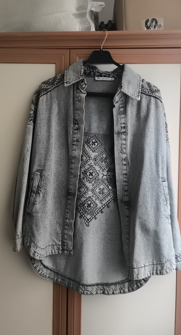 Gri renkte, uzun kollu, düğmeli, yakası çıtçıtlı ve nakışlı desenlere sahip bol kesim bohem tarzı kadın denim cekettir. Midi boyda, günlük kullanıma uygundur.