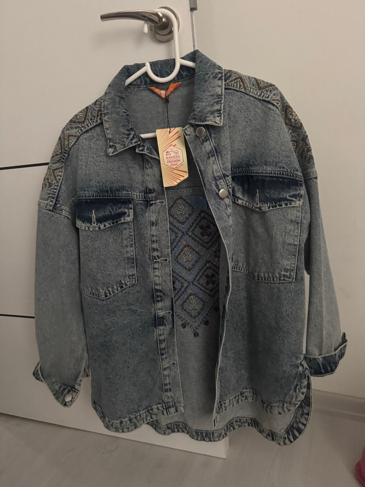 Gri renkte, nakışlı desenlerle süslenmiş, düğmeli, uzun kollu ve normal boyda bol kesim kot ceket. Bohem tarzını yansıtır. Gömlek ceket arası oversize model s-m-L bedenlerine uygundur