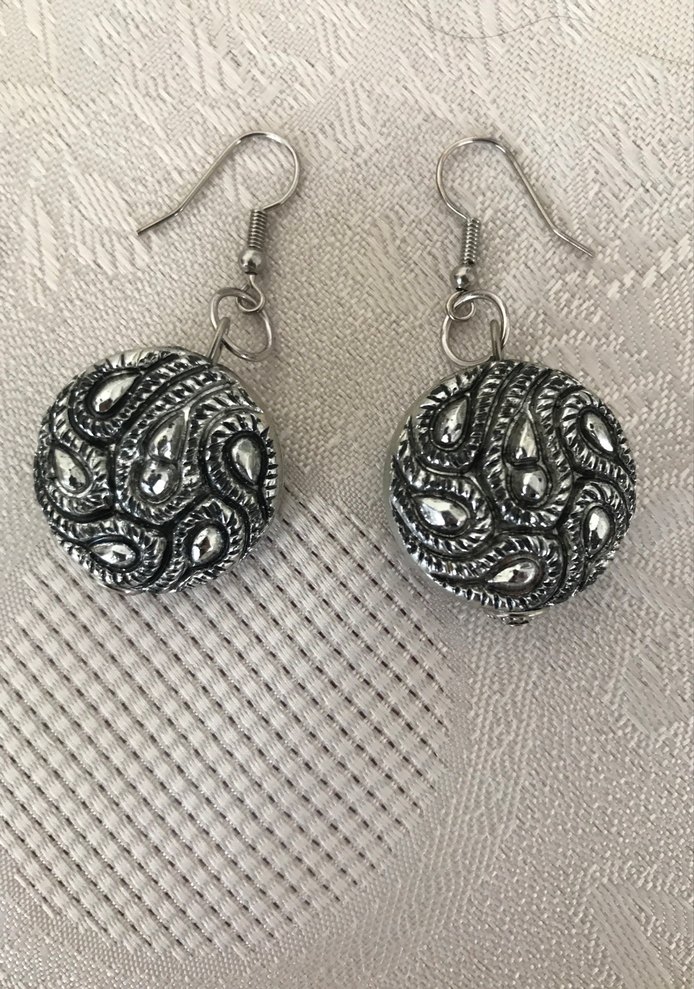 Nakışlı boncuk detaylı gri bohem tarzda küpeler, retro vintage havasında. Romantik akşamlar için normal midi uzunlukta.