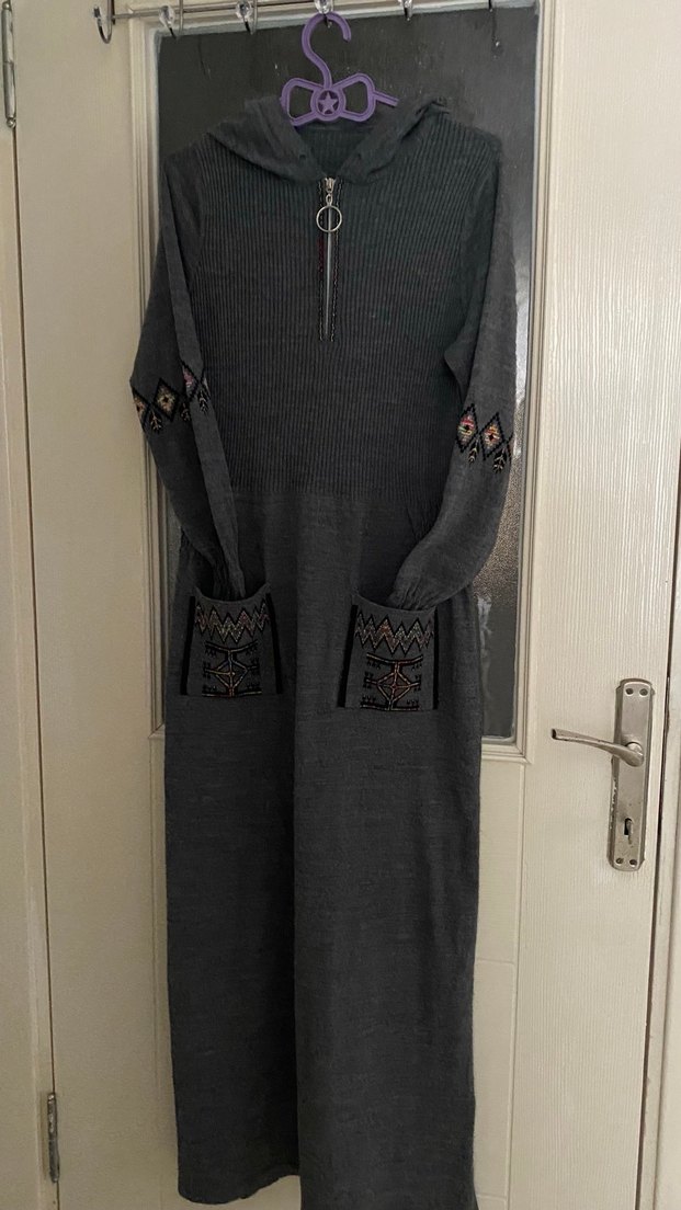 Gri triko uzun elbise, nakışlı detaylara sahip, bol kesimdir. Uzun kollu ve çentikli yaka ile bohem tarzda rahat bir modeldir.
