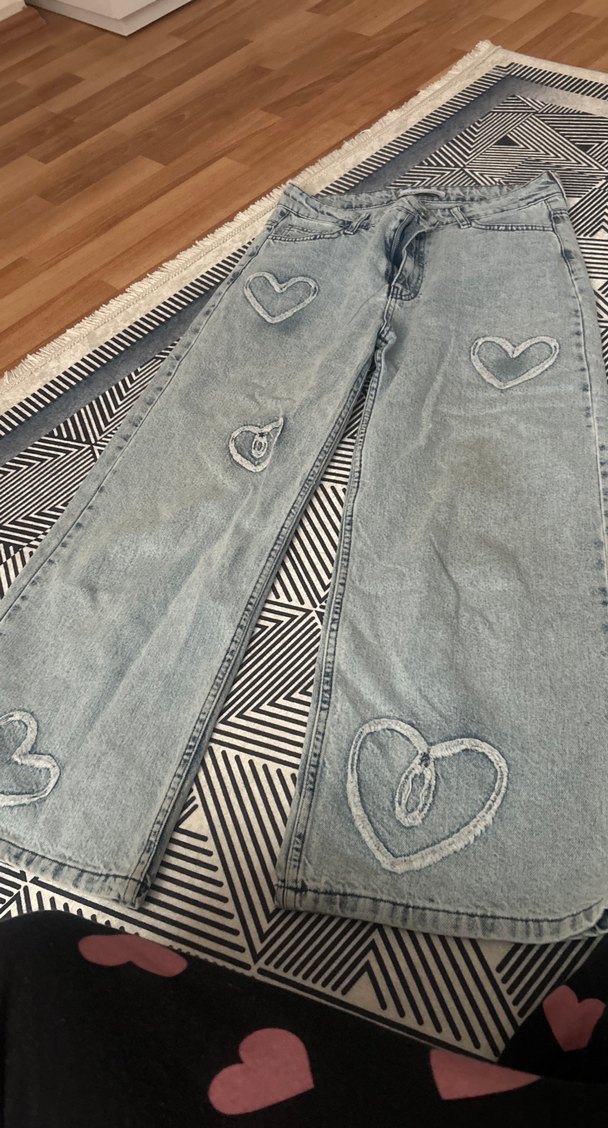 Nakışlı kalp desenleri ve düğmeli tasarımıyla gri renkte bol kesim kot pantolon, günlük rahat kullanım için uygundur.