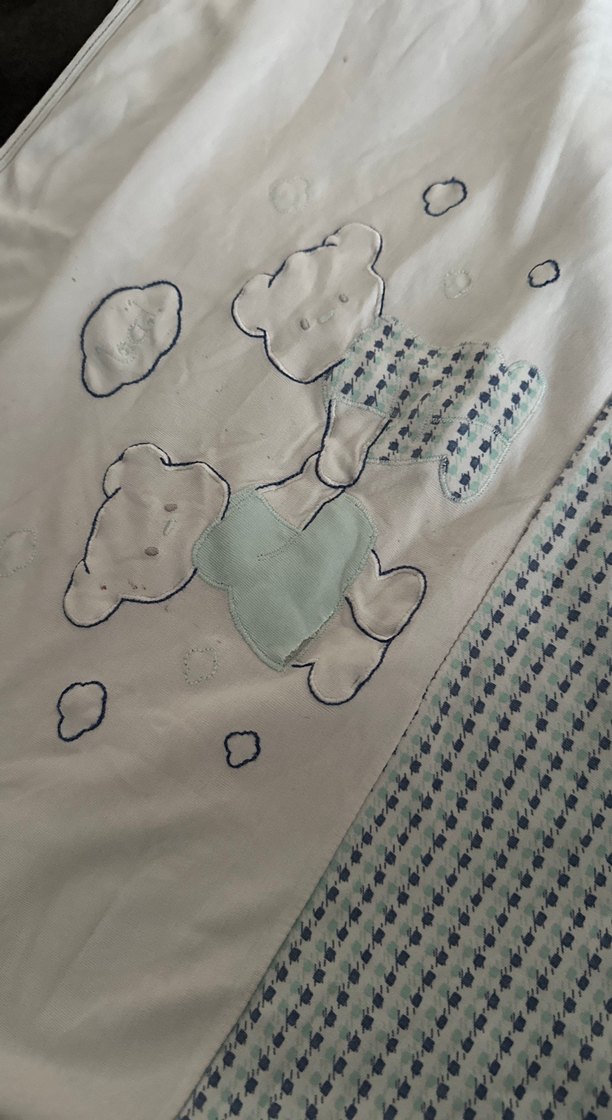 Yumuşak tekstil malzemeden yapılmış, nakışlı bulut ve ayı desenleri bulunan gri çocuk battaniyesi, rahatlık sağlar. ☁️ 60x80
