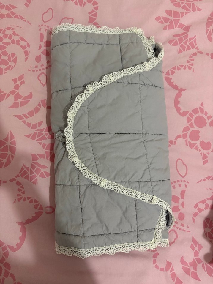Nakışlı kenarları olan gri alt açma örtüsü, yumuşak sentetik kumaştan üretilmiştir. Hafif ve kolay katlanabilir. Düğmeli Yastığı var Temiz 2 kez kullanıldı Özel dikim