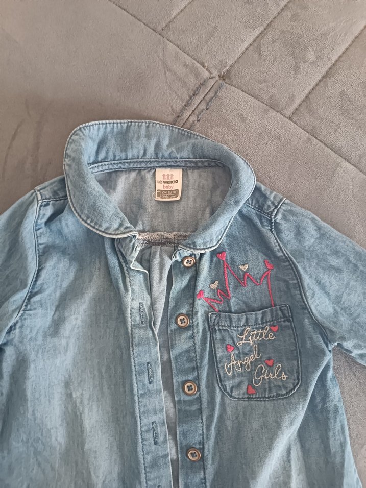 Gri kot kumaştan yapılmış, bol kesim, uzun kollu ve yakalı çocuk gömleği. Düğmeli ve cepte nakış detayları bulunur, rahat ve sokak modasına uygun.