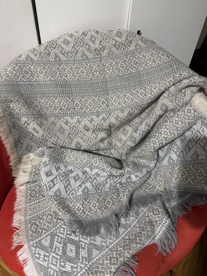 Nakışlı geometrik desenlere ve püsküllü kenarlara sahip gri şal, hem rahat hem dekoratif bir dokunuş sağlar. ️