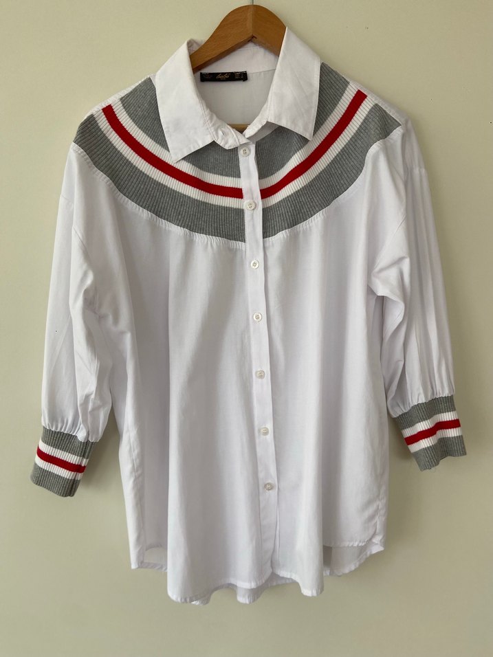 Uzun kollu, yakalı ve düğmeli beyaz kadın gömleği. Gri ve kırmızı nakışlı detaylar omuz ve manşetlerde yer alır. Pamuklu, bol kesim ve midi boyda, günlük rahat kullanıma uygun.