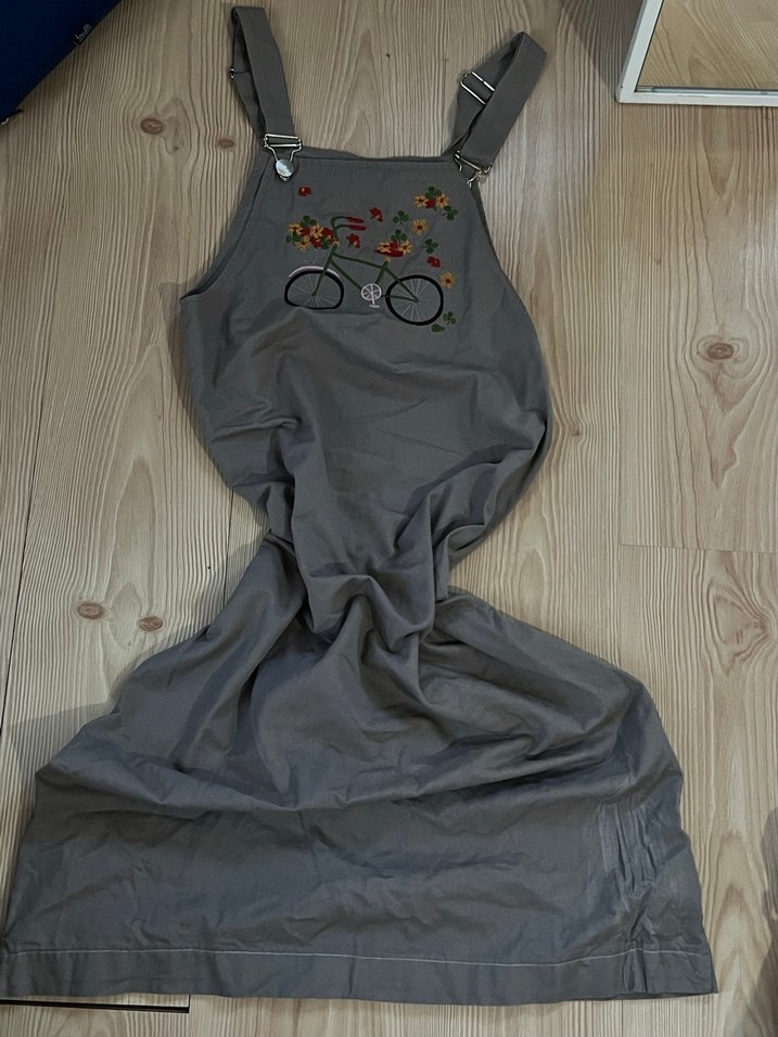 Yumuşak kot kumaştan, nakışlı çiçek ve bisiklet desenli gri elbise. Ayarlanabilir askılarıyla kullanışlıdır.