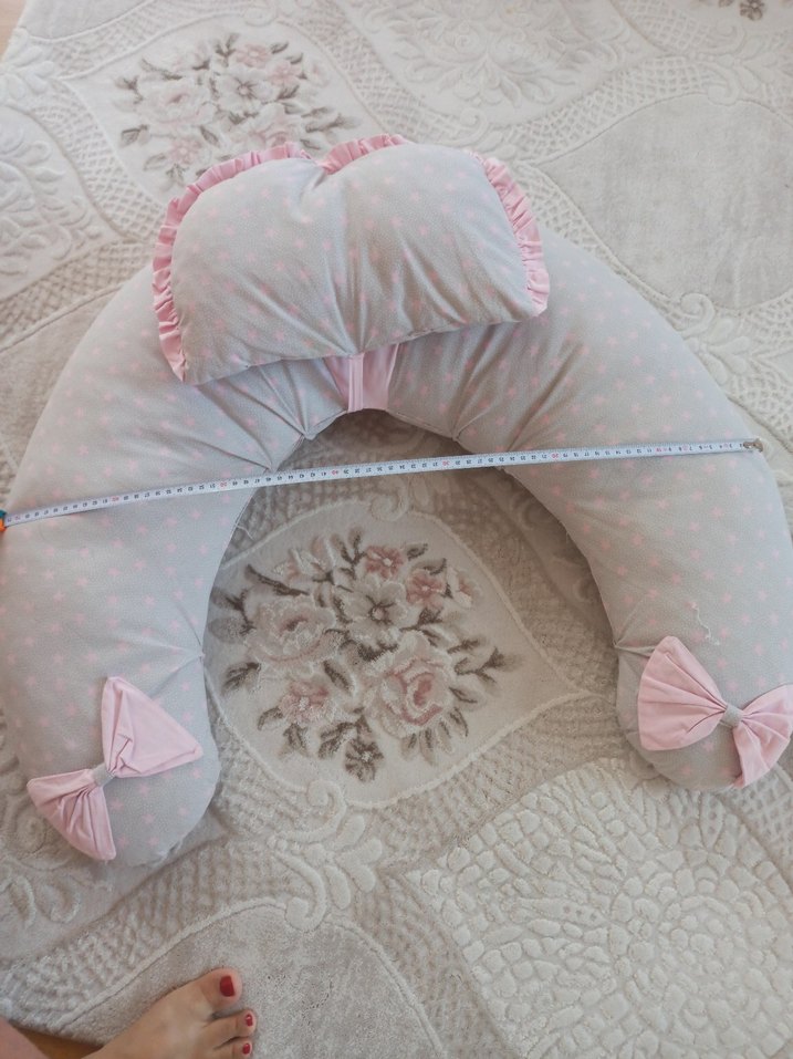Pastel gri renkli, nakış detaylı ve kurdele süslemeli yumuşak dokulu emzirme ve hamilelik yastığıdır. özel dikimdir isteğe göre puset örtüsü de gönderilecektir