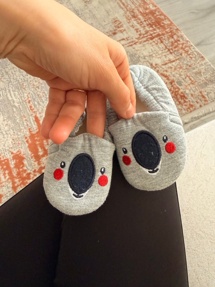 Nakışlı detaylara sahip gri erkek çocuk ev terliği, yumuşak ve sıcak kumaştan, rahat ve şık sokak stiline uygun.