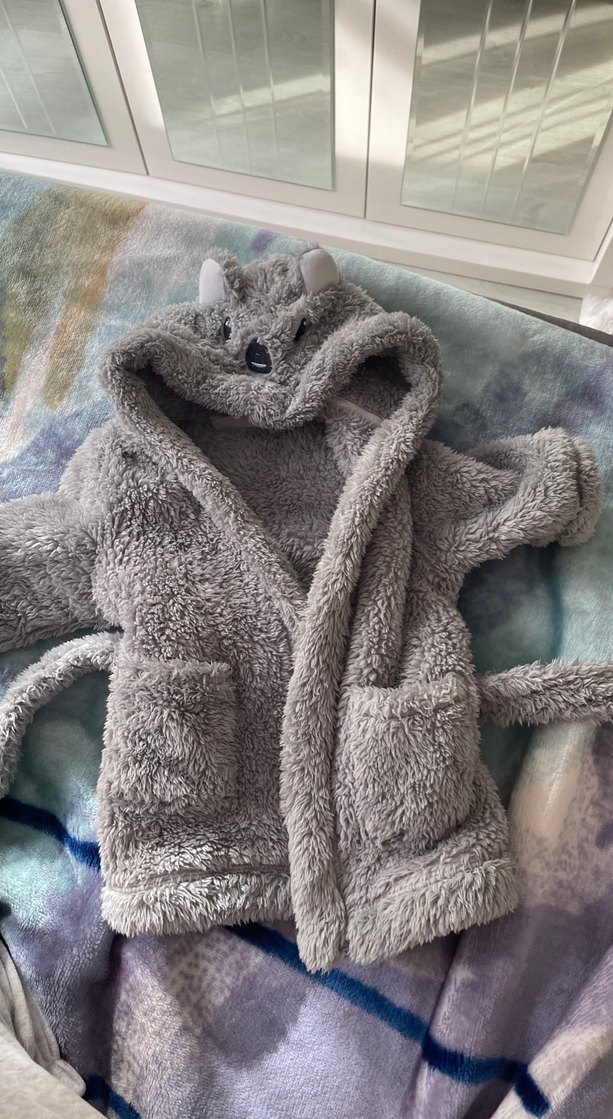 Yumuşak, peluş kumaştan yapılmış gri erkek çocuk bornozu, kapüşonunda nakışlı hayvan yüzü ve küçük kulaklarla rahat ve eğlenceli bir tasarıma sahiptir.