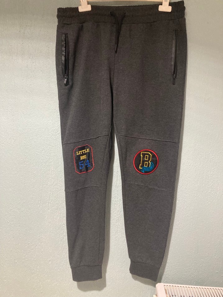 Gri renkli, bol kesim eşofman altı, nakışlı detaylar ve kemerli bel ile yumuşak ve sıcak kumaştan üretilmiştir.