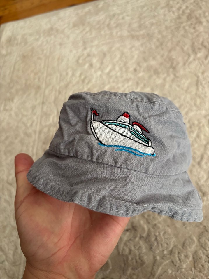 Nakışlı gemi desenli, düğmeli tasarıma sahip gri erkek çocuk şapkası, yumuşak ve sıcak kumaştan üretilmiştir. 1-1,5 yaşında giyebildi