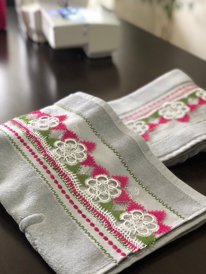 Gri renkte, pembe ve yeşil nakışlı çiçek desenleri bulunan klasik havlu. Yumuşak ve emici yapıya sahiptir. Tek kenar dantelli ve piko nakışlı çeyizlik havlu