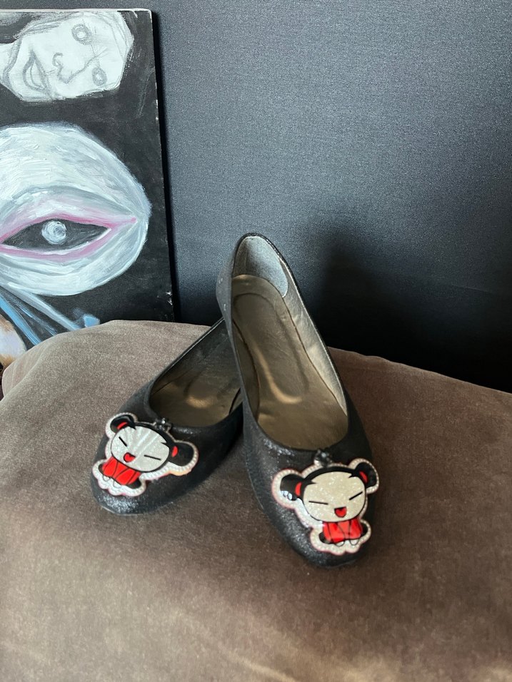 Gri renkte, nakışlı çizgi film detaylı ve tokalı tasarıma sahip kauçuk kadın babet. Günlük sokak stili için uygun, trend casual tarzda.