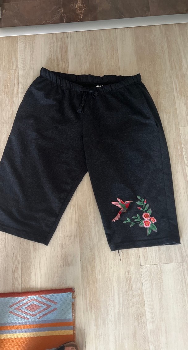 Gri renkli, nakışlı çiçek ve kuş desenli, bol kesim, cepli, yumuşak penye günlük kullanıma uygun bermuda şort.