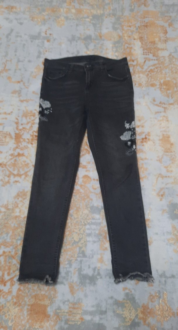 Gri renkte, nakışlı çiçek desenli ve tokalı detaylara sahip kadın denim pantolon. Normal boy ve regular fit, günlük kullanım için uygun.