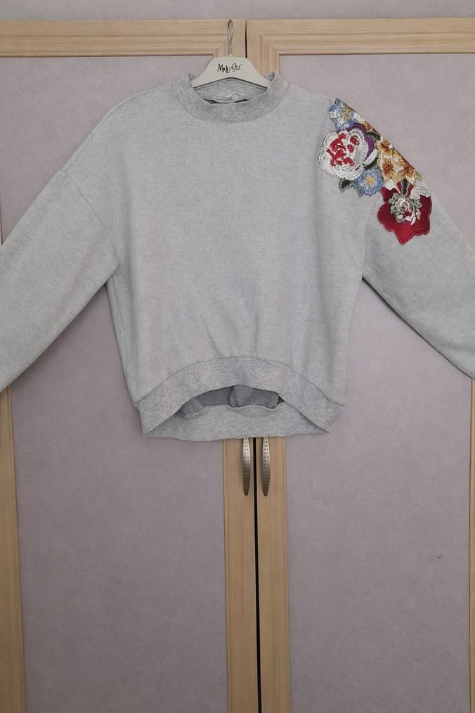 Gri kadın sweatshirt, yuvarlak yaka ve uzun kolludur. Yumuşak örgü kumaştan yapılmış, omuzda nakışlı çiçek desenleri vardır. Kısa boyu ile rahat bir sokak stili sunar. Göğüs 55 Boy 60 ✨️