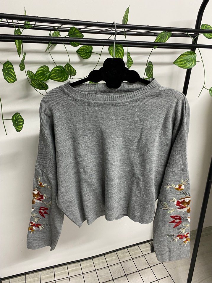 Gri renkte, uzun kollu ve yuvarlak yakalı triko kazak. Kollarında nakış detayları bulunur, rahat ve kısa kesimdir. Günlük sokak stili için uygundur.