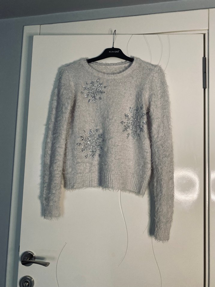 Gri renkte, nakışlı desenlerle süslenmiş, uzun kollu ve bol kesim kadın triko kazak. Yuvarlak yaka ve normal uzunluktadır, rahat sokak stili için uygundur. ❄️