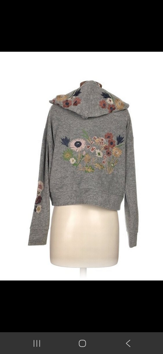 Gri renkli, kapüşonlu ve nakışlı çiçek desenli kadın sweatshirtü, rahat ve bol kesimlidir. göğüs 50 boy 50 cm
