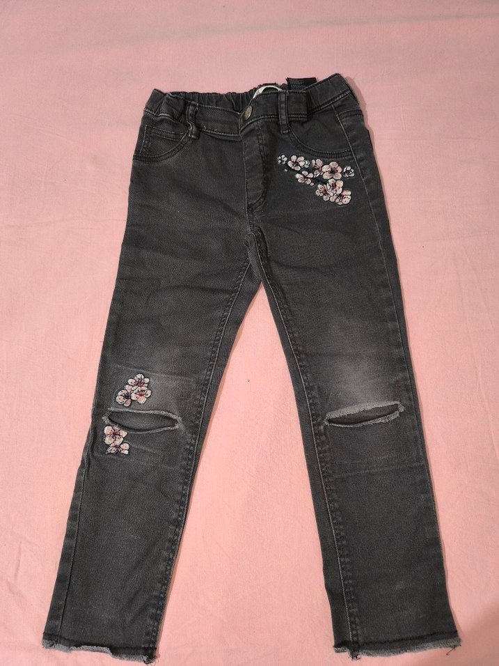 Nakışlı çiçek desenleri ve kemerli beliyle rahat kesim gri kot pantolon, trend sokak stili için ideal.
