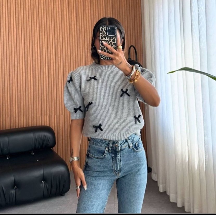 Gri renkli, nakışlı fiyonk detaylı, kısa kollu, yuvarlak yaka ve bol kesim örgü kadın kazak.