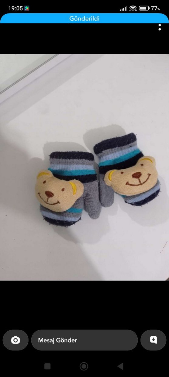 Renkli çizgili ve nakışlı ayıcık yüzlü, yumuşak ve sıcak kumaştan örme gri kız çocuk eldiveni. Günlük sokak stili için uygundur.