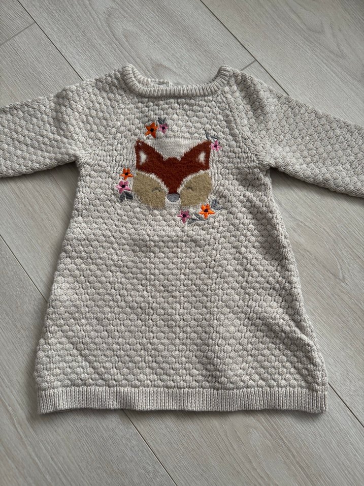 Gri renkli, uzun kollu, yuvarlak yakalı kız çocuk örgü kazak. Bol kesim ve dokulu örgü deseniyle, nakışlı tilki ve çiçek detayları içerir.