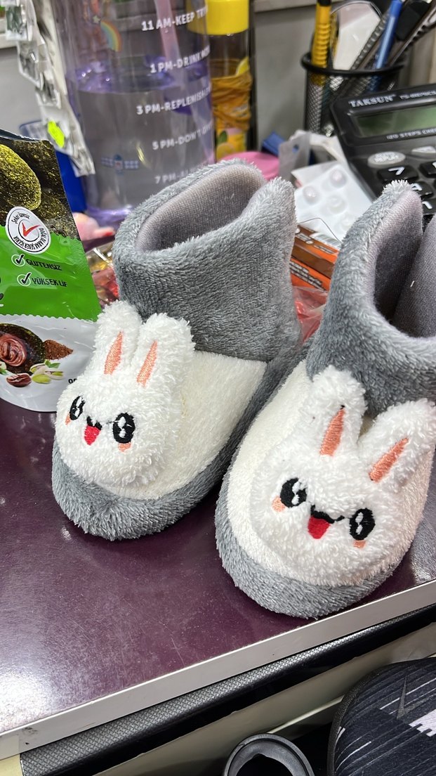 Nakışlı tavşan desenli, gri renkli, yumuşak ve sıcak kumaştan kız çocuk ev terliği.