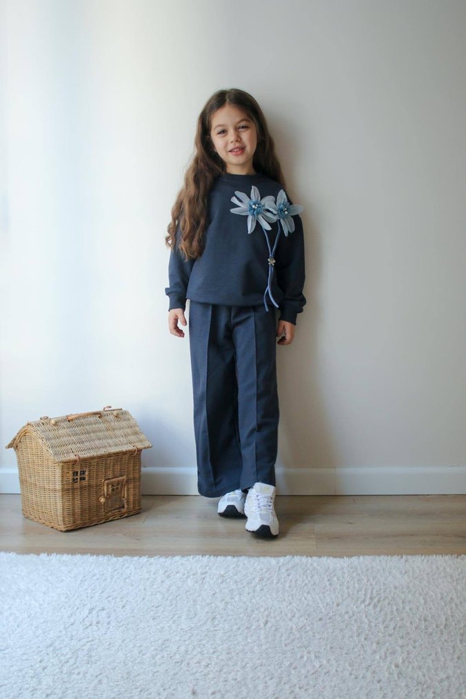 Gri renkli, nakışlı çiçek desenli kız eşofman takımı, uzun kollu ve yuvarlak yaka olup, rahat kesimi ve denim kumaşıyla şık bir görünüm sunar. 3/10 yaş