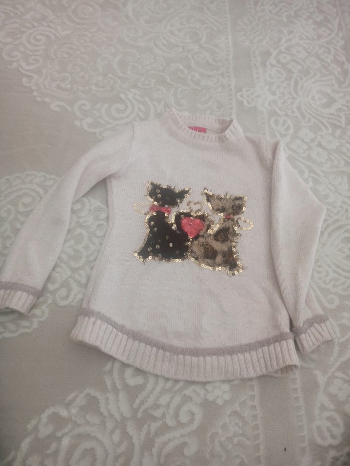 Fitted kesim gri triko kız kazağı, uzun kollu ve yuvarlak yakalıdır. Ön yüzünde kırmızı kalp tutan iki kedi nakışı bulunur, şık ve eğlenceli bir detay katıyor.
