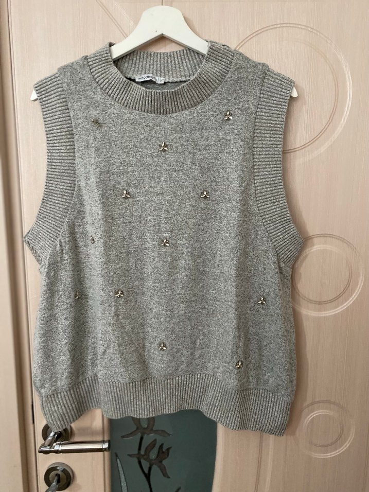 Gri renkli, nakışlı detaylara sahip kolsuz örgü kadın süveter. Yuvarlak yaka ve bol kesim ile günlük kullanıma uygun, rahat ve sokak stili sunar.