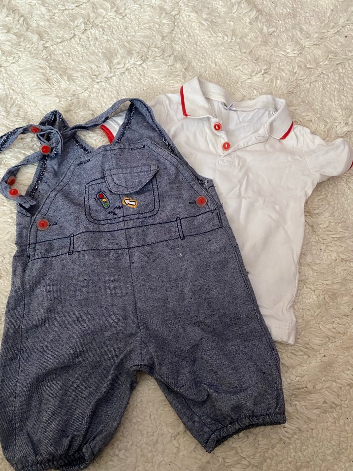 Düğmeli ve nakışlı desenli bol kesim gri kot tulum, kırmızı detaylı beyaz kısa kollu gömlekle birlikte.