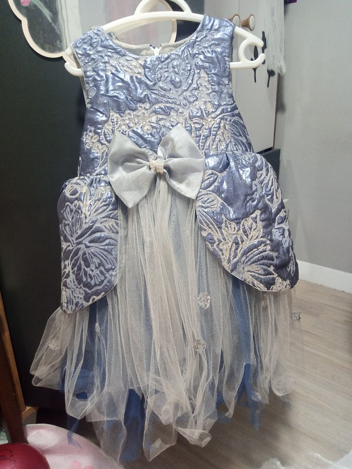 Nakışlı Gri Mavi Fırfırlı Kız Elbisesi