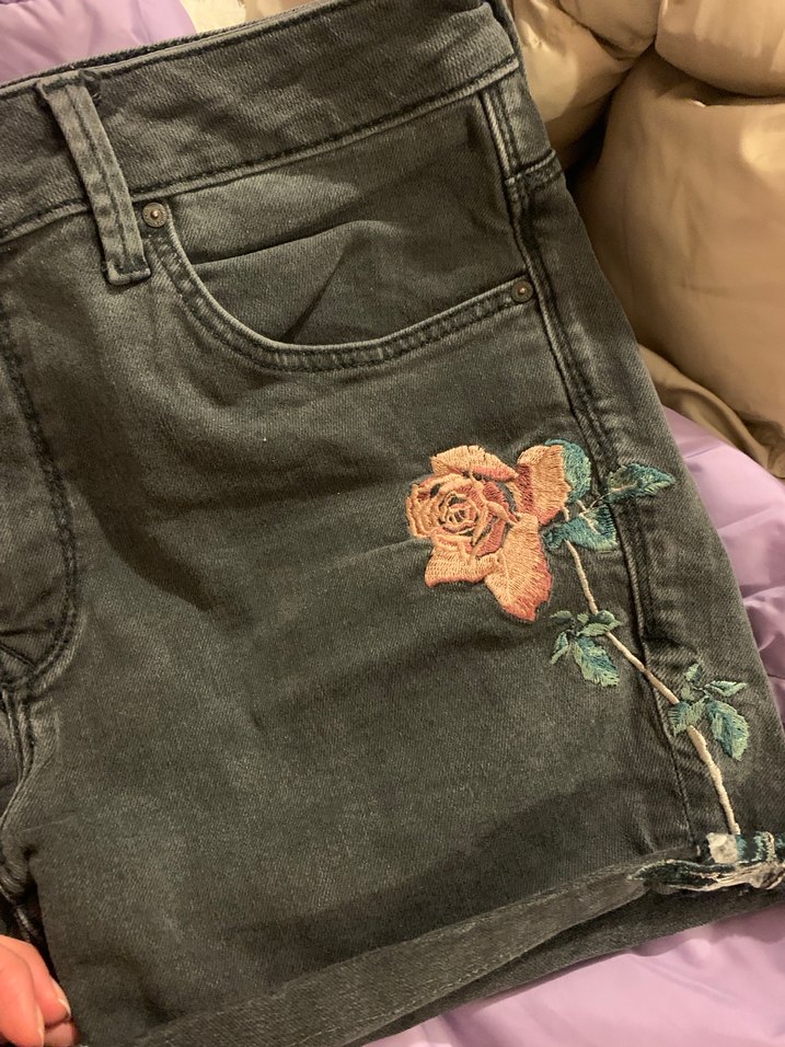 Nakışlı çiçek desenli koyu gri midi kot şort, düğmeli ve bol kesim. Bohem tarzda romantik akşamlar için uygundur.