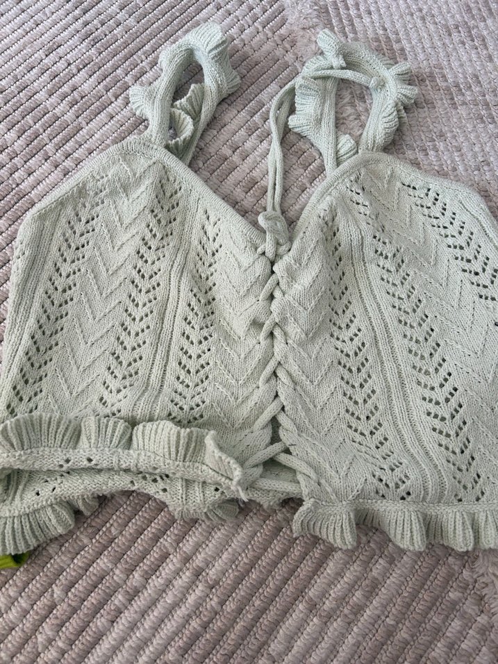Nakışlı, bohem tarzda pastel gri mini bralet. Kısa boylu, ayarlanabilir askılı ve zarif fırfır detaylıdır.