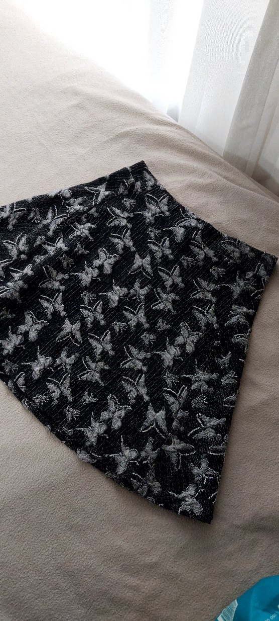 kabartmalı kelebek desenli, hafif pileli ve bol kesimli gri mini etek.