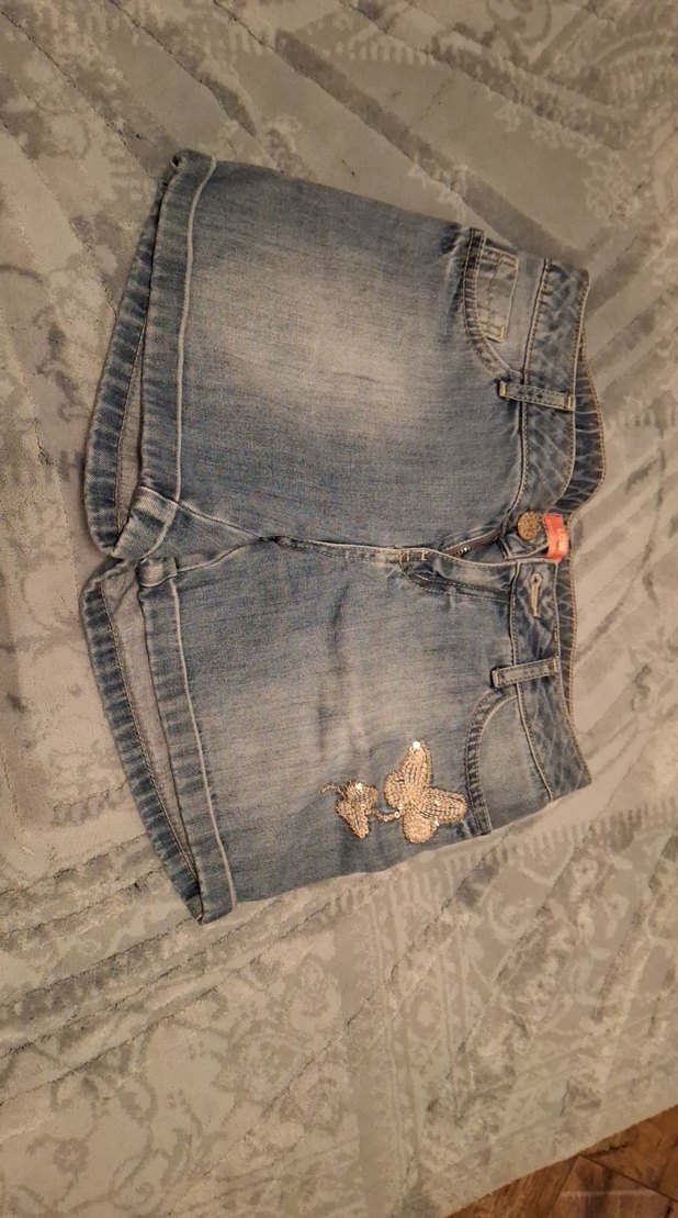Gevşek kesimli, düğmeli, mavi kot mini şortlar, nakışlı kelebek detaylarıyla günlük sokak stili için uygundur.