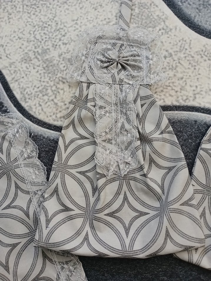 Nakışlı desenlere ve dantel detaylara sahip gri mutfak önlüğü, mutfakta şık bir dokunuş sağlar.