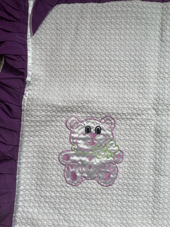 örgü kumaştan yapılmış çocuk pike, renkli ayı nakışı ve mor fırfırlı kenarıyla yumuşak ve rahat bir üründür. Ürün el yapımı göz nurudur
