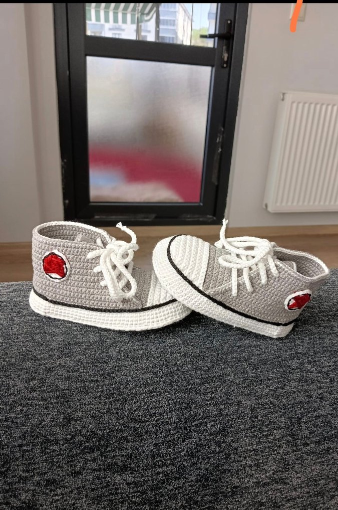 Nakışlı detaylara sahip gri örgü erkek bebek patikleri, sokak modası tarzında. Yumuşak örgü kumaş parçaları rahatlık ve sıcaklık sağlar. istenilen ölçüde ve renkte yapılır