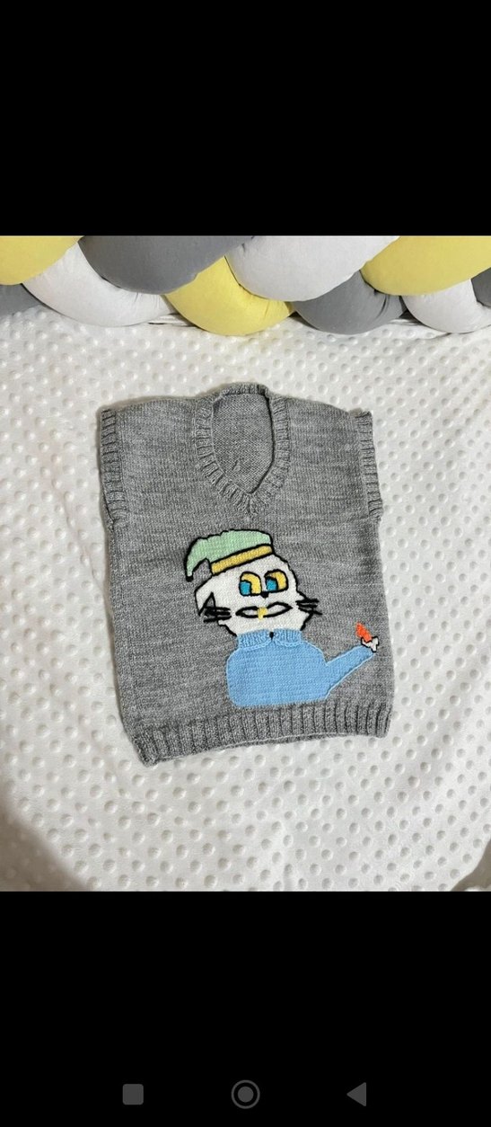 Nakışlı çizgi film desenli, gri örgü kedi kıyafeti, sokak stiliyle tasarlanmıştır. 92 cm 2 yaş