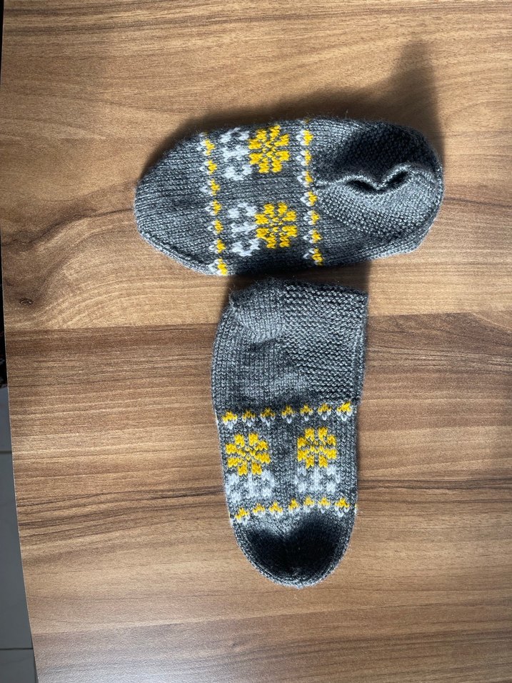 Sarı nakışlı desenlere sahip gri gri patik Rahat ve gevşek kesim, yumuşak ve konforlu dokuda. Ürünümüz beş şiş ile işlenmiştir
