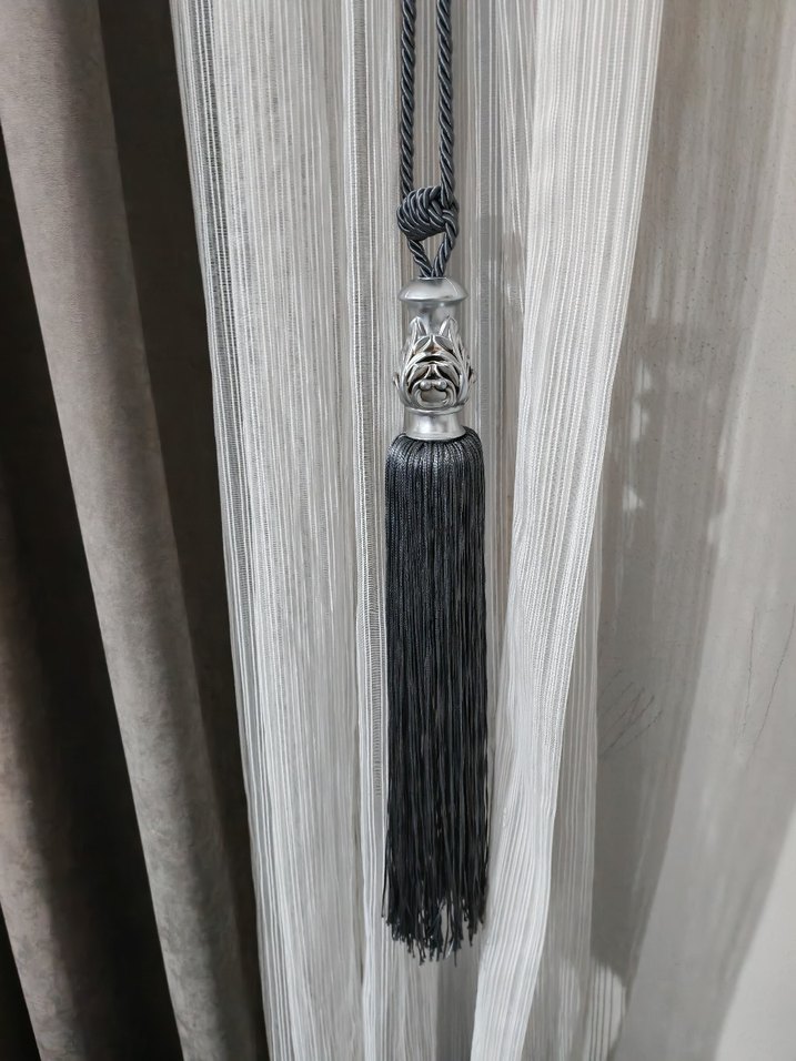 Nakışlı desenli gri klasik perde, dekoratif püskülle tamamlanmıştır. Kumaşı hafif ve dokuludur.