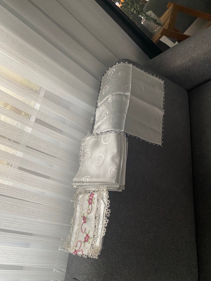 Nakışlı desenlere ve dantel detaylara sahip beyaz ve gri , klasik vintage tarzda.