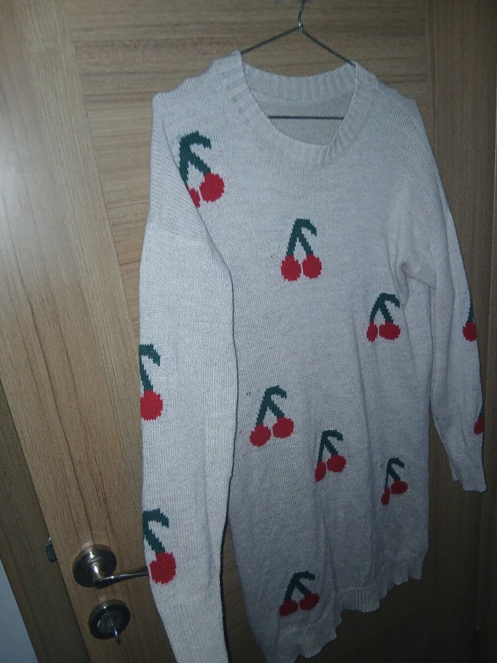 Gri renkli, nakışlı kiraz desenli, uzun kollu ve yuvarlak yakalı, bol kesim triko kadın kazak. Rahat ve sokak stiline uygun, günlük kullanıma ideal.