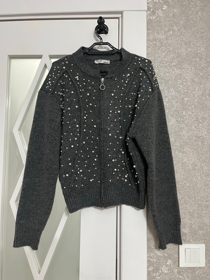 Uzun kollu, yuvarlak yaka ve nakışlı detaylara sahip, fitted kesim gri triko kadın kazak, rahat ve trend günlük stil sunar. Hırka butik ürünü ölçüleri son görsele ekledim