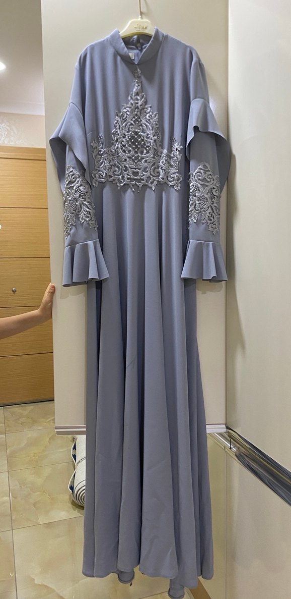 Nakış detaylı, bol kesim gri uzun abiye elbise, drapeli uzun kollu ve yuvarlak yakalı, gösterişli düğünler için uygun.